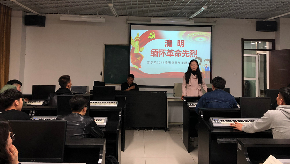 清明节凝结着中华民族的民族精神和民族情感,承载着中华民族的文化血脉和思想精华。为深切缅怀革命烈士的丰功伟绩和崇高精神,弘扬传承爱国主义精神,进一步增强学生的使命感与责任感,音乐系于2019年4月4日晚7时,在综合楼403组织开展了清明祭英烈活动。活动由专职辅导员赛娜老师主持,团总支书记张超老师、学生党员、学生骨干约四十余人参加。