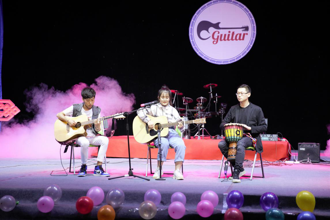 音乐会在动感十足的架子鼓表演中开场,激昂奔放的鼓点,点燃了观众们的激情。吉他社成员轮番上阵,舒缓温柔的《我愿意》、甜美可爱的《童话镇》、活力四射的《那就这样吧》、温和纯朴的《人家》,风格各异的音乐表演,给同学们带来了一场无比精彩的视听盛宴。指弹吉他曲《Wings you are the hero》中,吉他手击弦、扫弦、泛音等技巧运用娴熟,欢快的旋律洗涤着观众们的心灵。摇滚歌曲《大风吹》激情澎湃,嗨翻全场,主唱铿锵有力的声音感染着每一人,同学们纷纷起立挥舞手臂与乐队一同浸没在重金属音乐中。