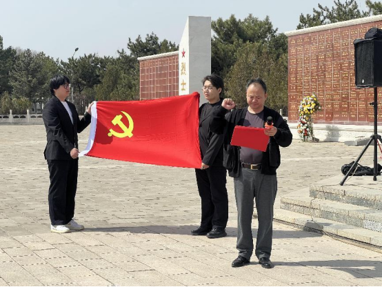 鲜花敬献英烈,哀思祭奠忠魂。全体师生在革命烈士纪念碑前庄严列队,敬献鲜花,鞠躬默哀,追思革命先烈的丰功伟绩,并向他们致以崇高的敬意。随后,4名学生代表进行了“缅怀革命先烈,传承红色基因”主题演讲,用真挚的语言表达了莘莘学子立志报国之心,拳拳爱国之情。党总支书记齐占柱带领全体党员重温入党誓词,铿锵有力的誓言回荡在烈士陵园的上空,也激荡在每个党员心中。