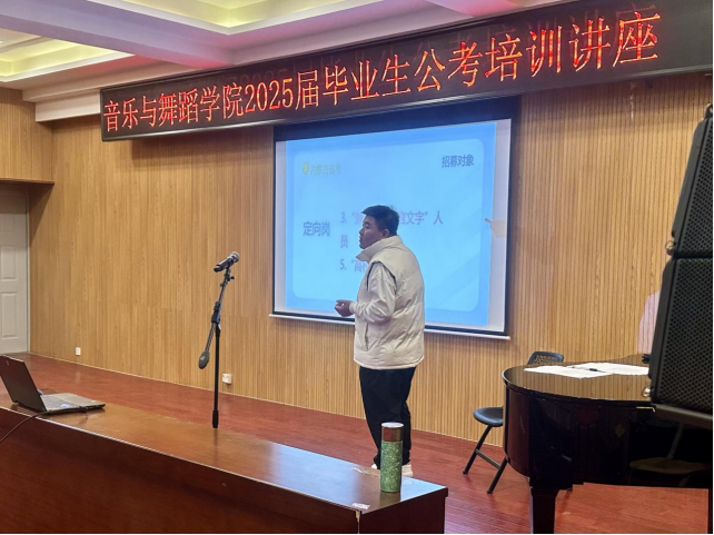 为进一步提升广大学生的就业竞争力,深入了解公务员、事业单位考试的备考政策,加强毕业生应考能力。11月13日晚,音乐与舞蹈学院在音乐楼多功能厅邀请了蒙政公考塔拉讲师为同学们作考公专题知识讲座,2025届全体毕业生参加了此次讲座。