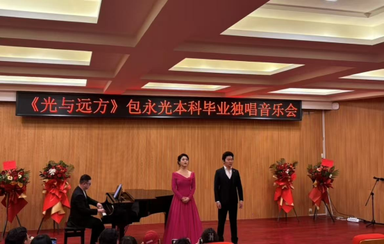 2025年4月15日晚,音乐与舞蹈学院多功能音乐厅座无虚席,包永光同学的"光与远方"本科毕业独唱音乐会在这里精彩上演。作为音乐表演专业的优秀毕业生,包永光以饱满的热情和专业的演唱功底,为现场观众带来了一场高水平的音乐盛宴。