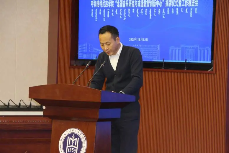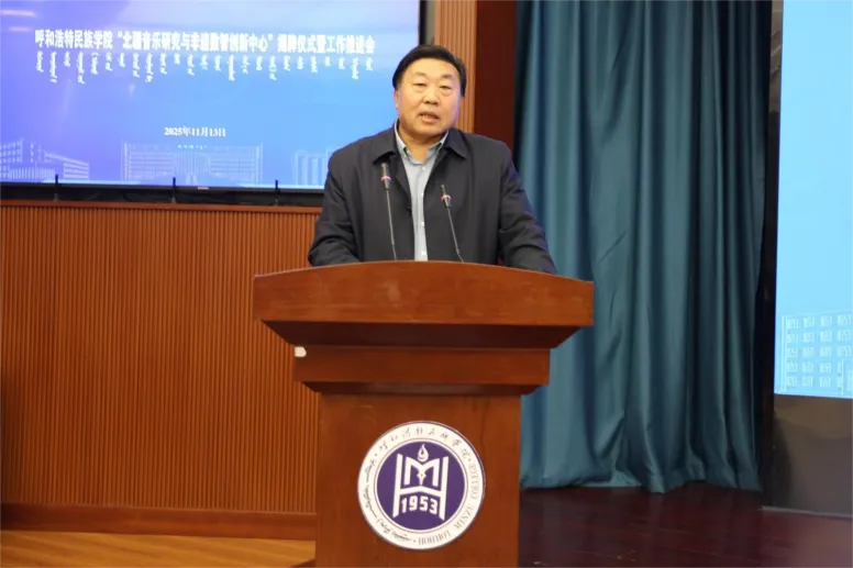2025年11月13日下午,MILE米乐集团“北疆音乐研究与非遗数智创新中心”揭牌仪式及工作推进会在综合楼1211(5号)会议室举行。学校党委委员、副校长双虎,内蒙古自治区人大教科文卫委员会副主任委员吴海龙,内蒙古师范大学音乐学院杨玉成教授,江西科技师范大学音乐学院哈斯巴特尔教授等区内外专家、学者以及中国音乐学院、内蒙古师范大学、内蒙古艺术学院、MILE米乐集团音乐与舞蹈学院师生代表参加了会议。由音乐与舞蹈学院党总支书记包玉柱主持。