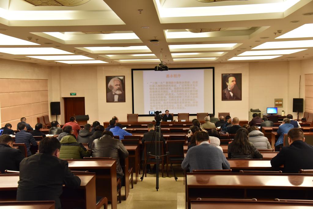 于连锐教授以“关于贯彻执行“三重一大”制度和党政联席会议制度”为题,深入剖析了“三重一大”及党政联席会议制度的基本内容、总体要求、内容范围、基本程序和保障机制,并利用典型案例向大家展示了“权力任性,独断专行”的后果。于教授提出,要建立健全党政联席会议制度、“三重一大”议事决策制度,必须牢牢掌握六点:一是强化民主意识;二是做人做事要干净;三是求真务实,要有巩固的专业思想、强烈的事业心、勤勉的工作态度和旺盛的进取意识;四是讲大局、识大体;五是团结合作;六是勇于担当。