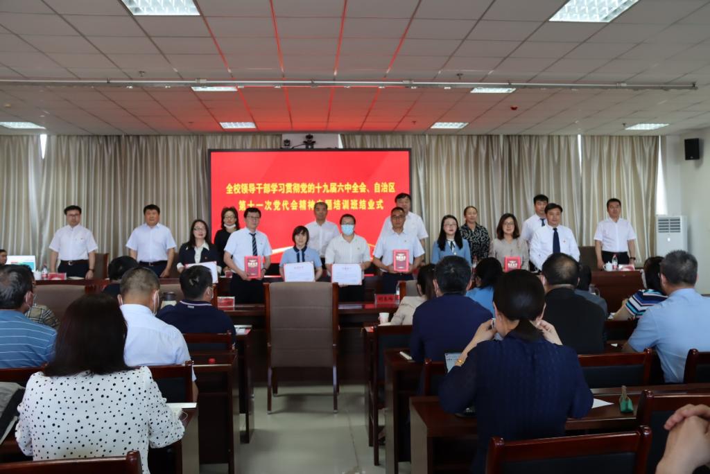 为深入学习贯彻党的十九届六中全会精神和自治区第十一次党代会精神,更好地落实以史为鉴、开创未来的重要要求,深刻认识“两个确立”的决定性意义,大力弘扬伟大建党精神,进一步提升干部队伍服务学校中心大局、努力担当作为的素质能力,5月28日—6月6日,学校举办了领导干部学习贯彻党的十九届六中全会精神、自治区第十一次党代会精神专题培训班,全校120余名处级以上干部参加了培训。