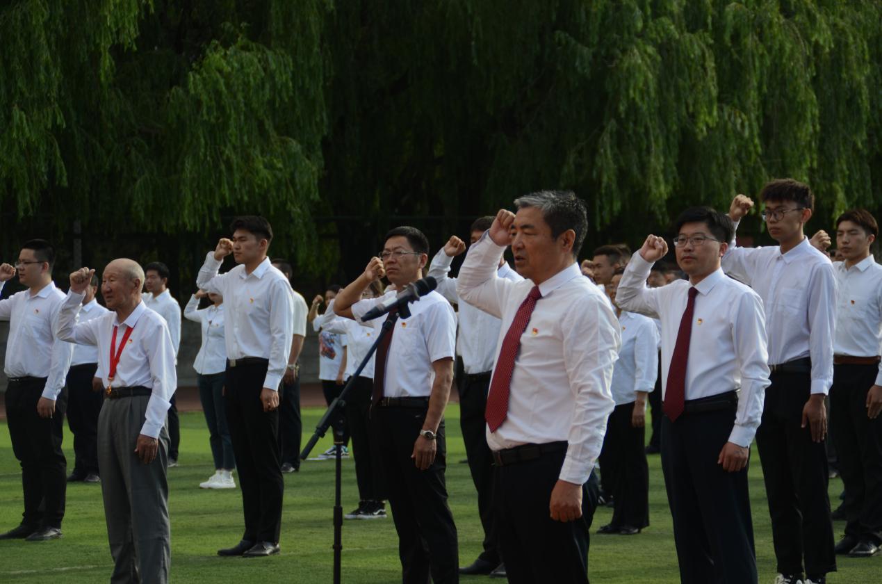 为庆祝中国共产党成立100周年,进一步激励全校基层党组织和广大党员师生铭记党员责任和义务,增强党员的光荣感和使命感,6月21日,米乐官网在北运动场隆重举行庆祝中国共产党成立100周年党员宣誓仪式。学校党委副书记、校长格日乐图,党委副书记胡春梅,党委委员、副校长韩伟新,党委委员、纪委书记、监察专员王冬梅,党委委员、副校长高喜天,“光荣在党50年”纪念章获得者、教职工党员和学生党员,离退休党员代表共1000人参加集体宣誓。胡春梅副书记主持宣誓活动。