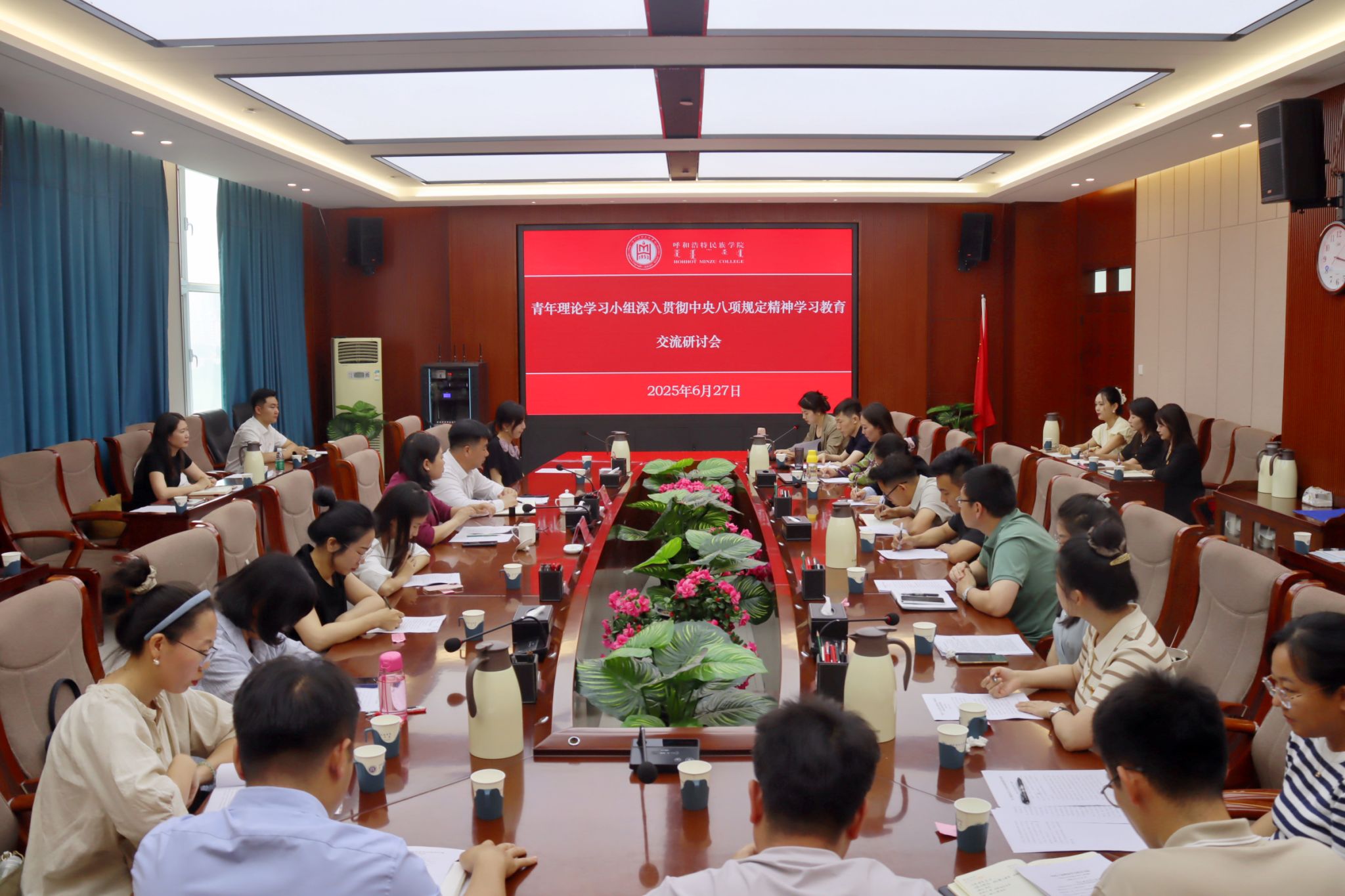 6月27日,学校在综合楼十一楼会议室举行青年理论学习小组深入贯彻中央八项规定精神学习教育第二次研讨会,校党委副书记格根哈斯出席并讲话,校党委委员、组织部部长吴阿古拉主持会议,青年理论学习小组全体成员参加会议。